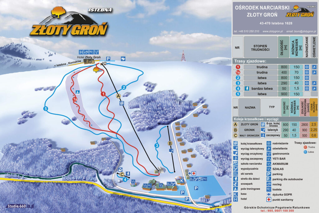 Nowoczesny obiekt otwarty zimą 2012/2013, nowa kolej krzesełkowa, stok naśnieżany i oświetlony, duży parking zaraz pod wyciągiem, 10 min. jazdy samochodem od hotelu.